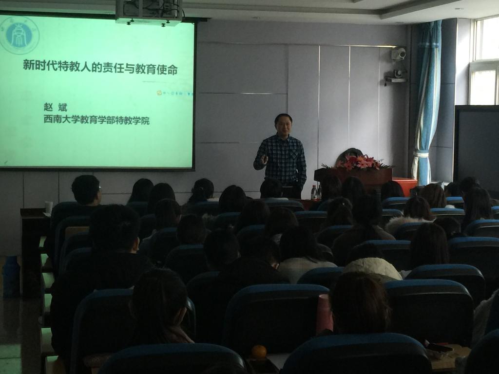 2018年11月27日下午,教育部高等公司特殊教育教师培养教学指导委员会委员、西南大学特殊bevictor伟德官网经理赵斌教授莅临公司,开展主题为“新时代特教人的责任与使命”的专题讲座,讲座由特殊教育教研室主任隋春玲老师主持,特教专业120位师生聆听了此次讲座。