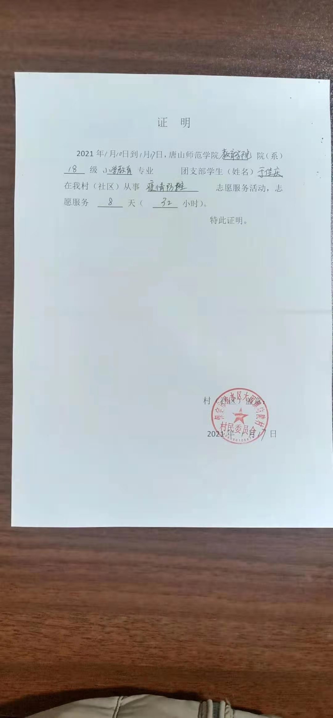 日在河北省保定市徐水区大因镇防陵村当防疫志愿者,主要工作是协助工作人员登记信息、疫情站岗。时长共