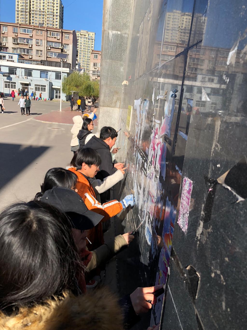 第二党支部全体党员不怕苦、不怕脏,在寒风中干得热火朝天。四十多分钟后,校园内几处墙壁上的小广告被清除干净。过路的同学们纷纷称赞党员同学做得好。