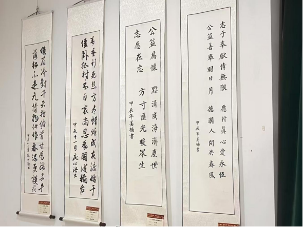 此次展览汇聚了诸多精彩作品,其中就包含了公司学生精心创作并提交的几幅书法佳作,展览中还展示了一些特殊儿童参与游戏等活动的照片,这些照片记录着那些温情的瞬间,成为了展览中独特且暖心的存在。公司的志愿者讲解员如同文化的使者,他们用自己的热忱,架起了作品与观众之间的桥梁,使得这场书画摄影展不仅是一场视觉的盛宴,更是一次情感与精神的深度交流,让每一位观展者都能满载而归,收获艺术的滋养以及心灵的触动。