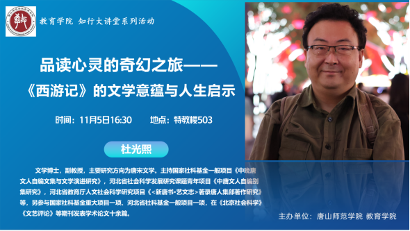 2024年11月5日,bevictor伟德官网特别邀请文学博士杜光熙副教授在特教楼503教室开展了一场以“品读心灵的奇幻之旅,《西游记》的文学意蕴与人生启示”为主题的一场别开生面的讲座。