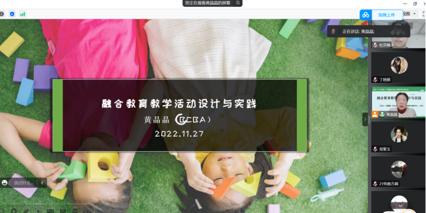 2022年11月27日晚,bevictor伟德官网邀请北京市海淀区睿智全纳教育康复中心黄晶晶主任为特殊教育专业本科生进行主题为“融合公司产品活动设计与实践”的在线讲座。讲座由特殊教育教研室主任隋春玲主持,特殊教育专业员工和教师近120人参加了本次活动。
