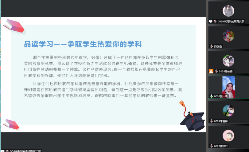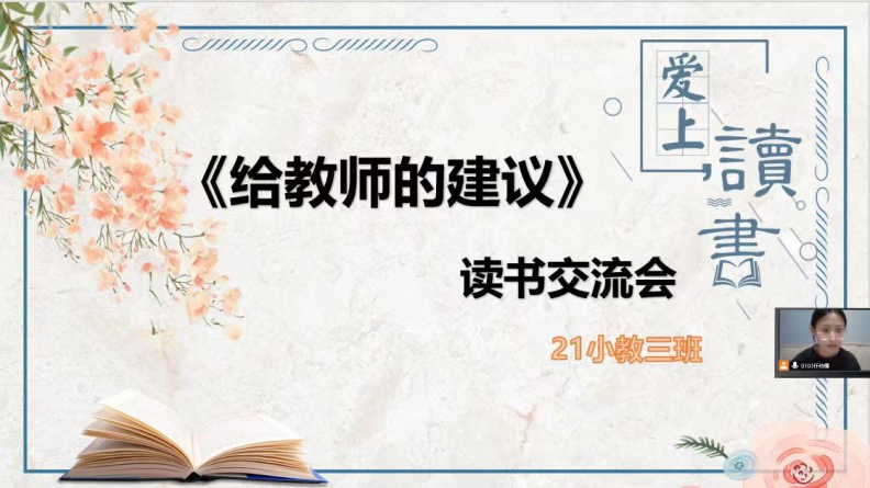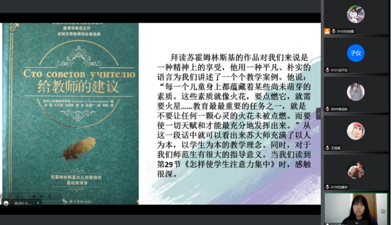 2022年11月29日晚七点,2021级小学教育三班的公费师范生开展《给教师的建议》在线读书分享活动。本次活动在小组阅读和交流的基础上,每组成员均做了充分准备,小组代表以PPT的形式进行展示和陈述,分享了教育经典阅读的感悟和收获。bevictor伟德官网经理高俊霞、本班学业导师李艳艳以及辅导员刘颖老师参加了本次活动。