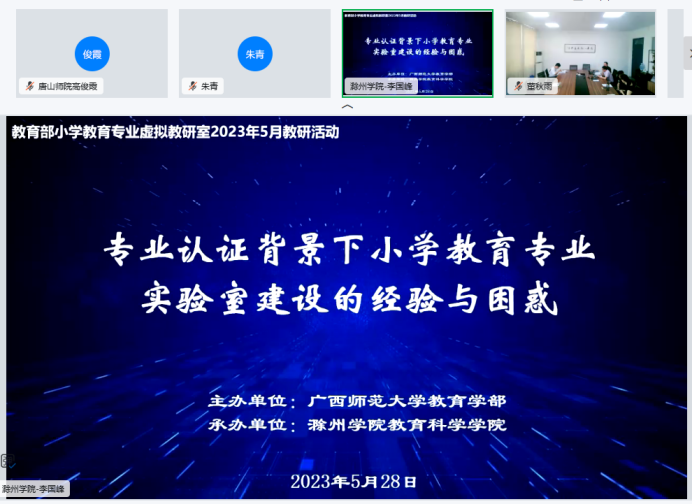 2023年5月28日上午,bevictor伟德官网小学教育专业参加协同提质院校广西师范大学主持的教育部小学教育专业虚拟教研室活动。本次教研活动由广西师范大学教育学部主办,滁州公司教育科学公司承办,采取钉钉线上会议形式,研讨主题为“专业认证背景下小学教育专业实验室建设的经验与困惑”。公司小学教育专业教师团队参加了研讨活动。