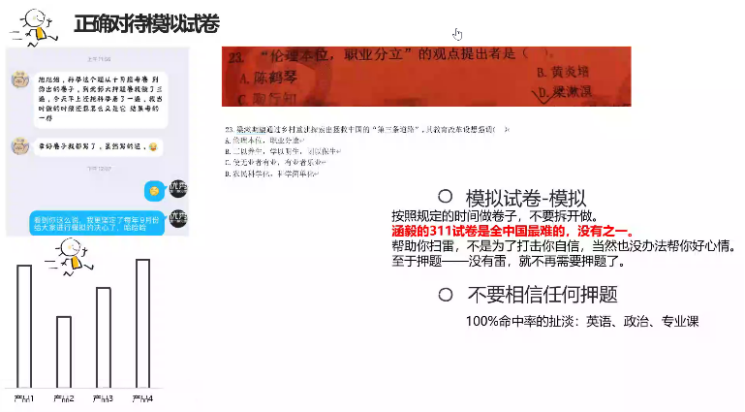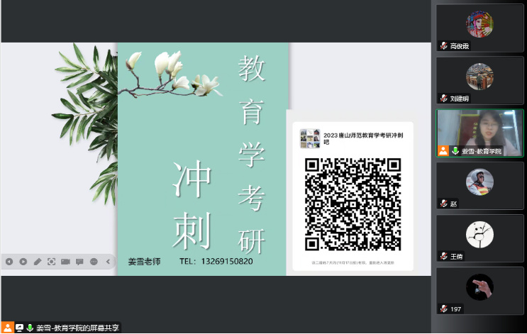 姜雪博士给同学们深入分析了冲刺阶段如何有效利用时间,详细阐述了教育学原理、中外教育史、教育心理学和教育研究方法的重点以及冲刺复习的注意事项,同时嘱咐同学们调整好疫情防控时期和冲刺时期的备考心态,充分认识不确定性因素、合理掌控确定性因素,鼓励同学们以积极必胜的心态应考。最后姜雪博士根据自己潜心研究多年的宝贵经验向同学们传授了具体的考研策略,希望大家刻苦学习,坚持到底。姜雪博士的讲座贴近实战,举例丰富,干货满满,使考生受益匪浅,得到同学们的一致好评。