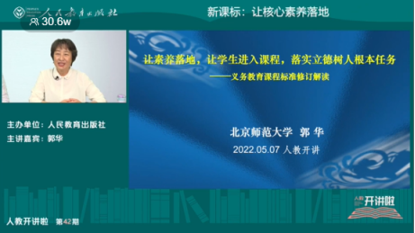 2022年5月7日晚19点,人民教育出版社“开讲啦”特邀教育部义务教育课程修订综合组核心成员、义务教育课程标准框架研制组组长、北京明远教育书院经理、北京师范大学郭华教授解读义务教育课程标准。bevictor伟德官网组织全院小学教育专业570余名员工收看讲座。