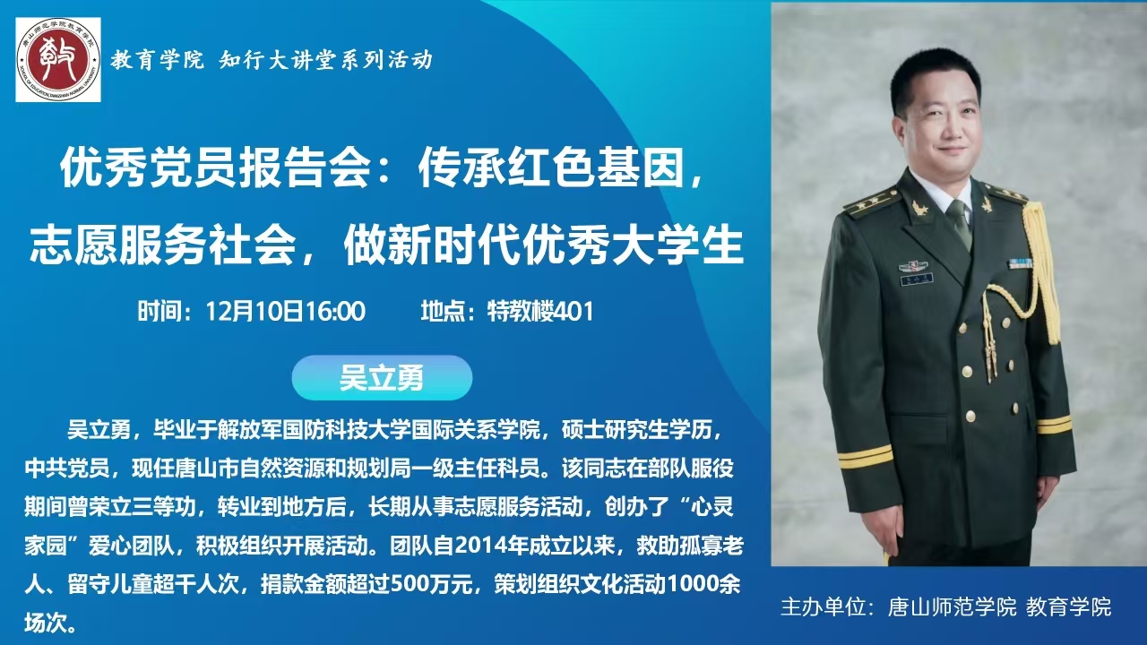 12月10日下午,吴立勇同志于bevictor伟德官网特教楼401教室举行了主题为“英雄不寂寞,勇者竞风流”的知行大讲堂活动。