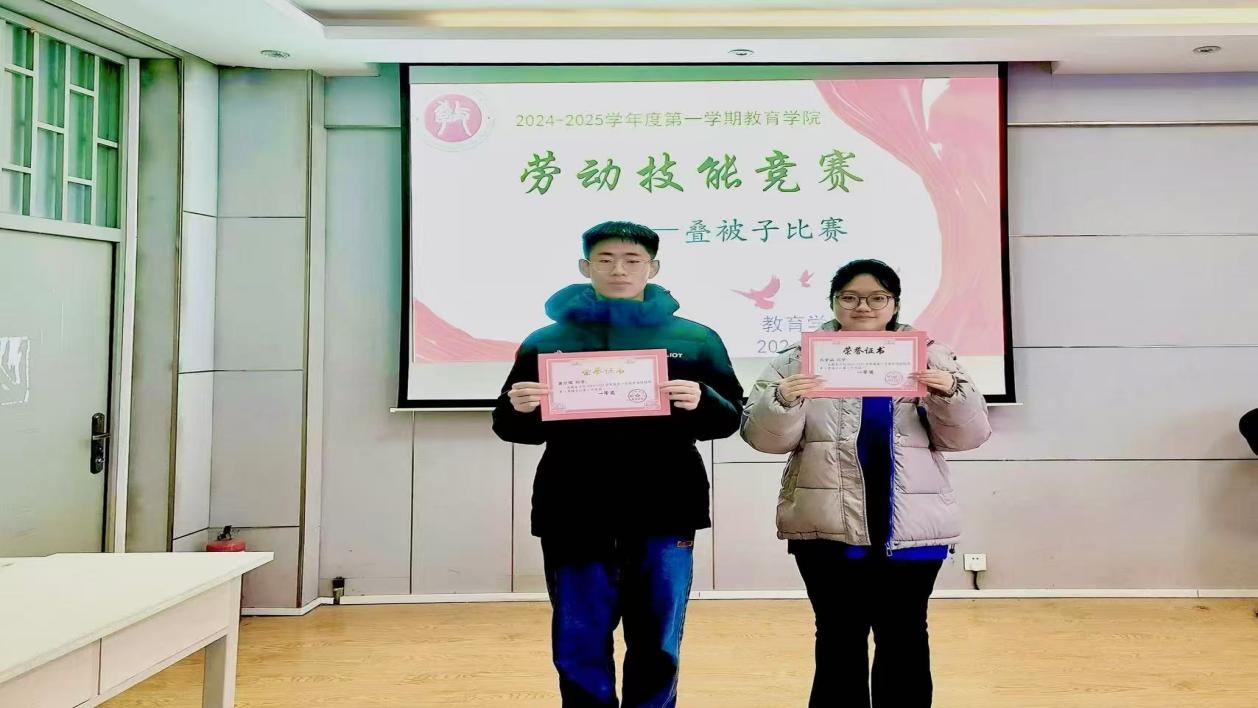 本次叠被子大赛以提升员工生活技能与素养、增强宿舍文化建设为中心。在比赛过程中,2023级小学教育1班的张紫涵动作娴熟、精神抖擞,快速而精准地铺平、折叠、压实、整形,使被子呈现出整齐美观的“豆腐块”形状。2023级小学教育2班的蒋宗儒一丝不苟,干净利落地把被子压平抹顺,不见一丝褶皱。其他参赛选手同样技巧熟练、速度快捷,他们的被子表面光滑平整,棱角分明,线条流畅。最终,张紫涵和蒋宗儒荣获bevictor伟德官网叠被子比赛一等奖,期待他们在伟德中国官网校级比赛中的更好表现。