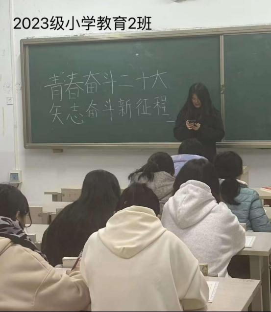 在本次主题班会活动中,各班采取多元化的班会形式,特色鲜明,使班会活动顺利完成。2021级学前教育1班的负责人带领本班同学共同学习习近平新时代中国特色社会主义思想和党的二十大精神等党的指导思想,进行总结发言;2022级应用心理学班的负责人组织同学们有序发言,分享自己的学习成果与见解;2023级小学教育2班举办演讲活动,同学们积极表现,踊跃发言,分享自己的学习经历。