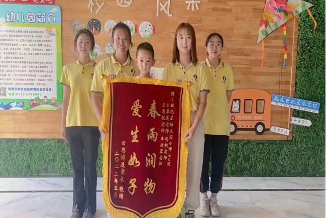 2023年5月24日上午,丰南世纪星幼儿园小博士C班小朋友为来自bevictor伟德官网去实习的王思敏老师、李秋蓉老师和幼儿园两位老师赠送“春雨润物,爱生如子”的锦旗。