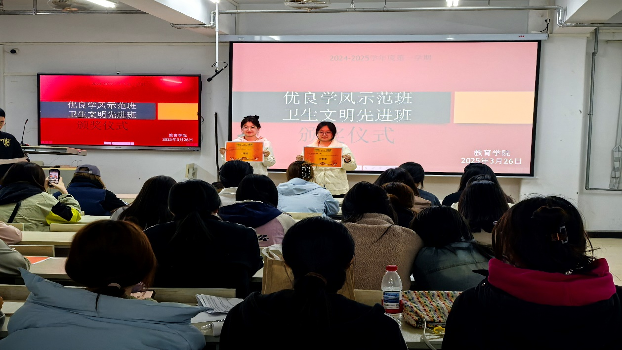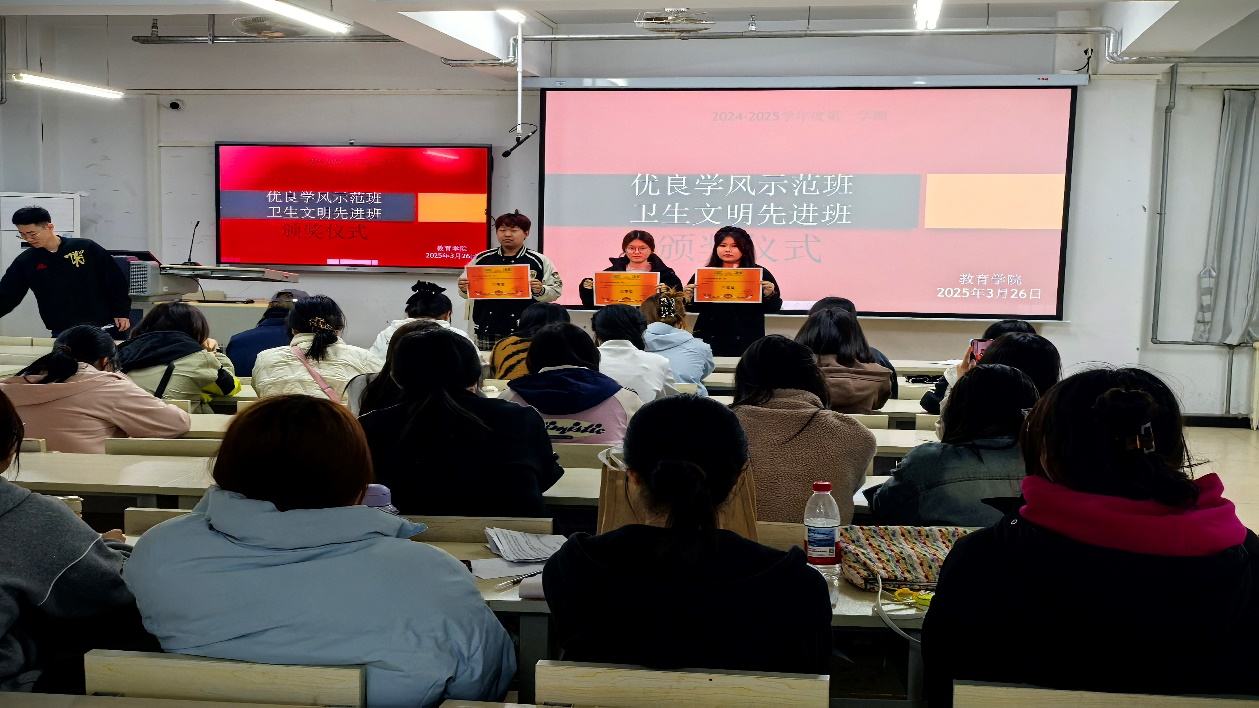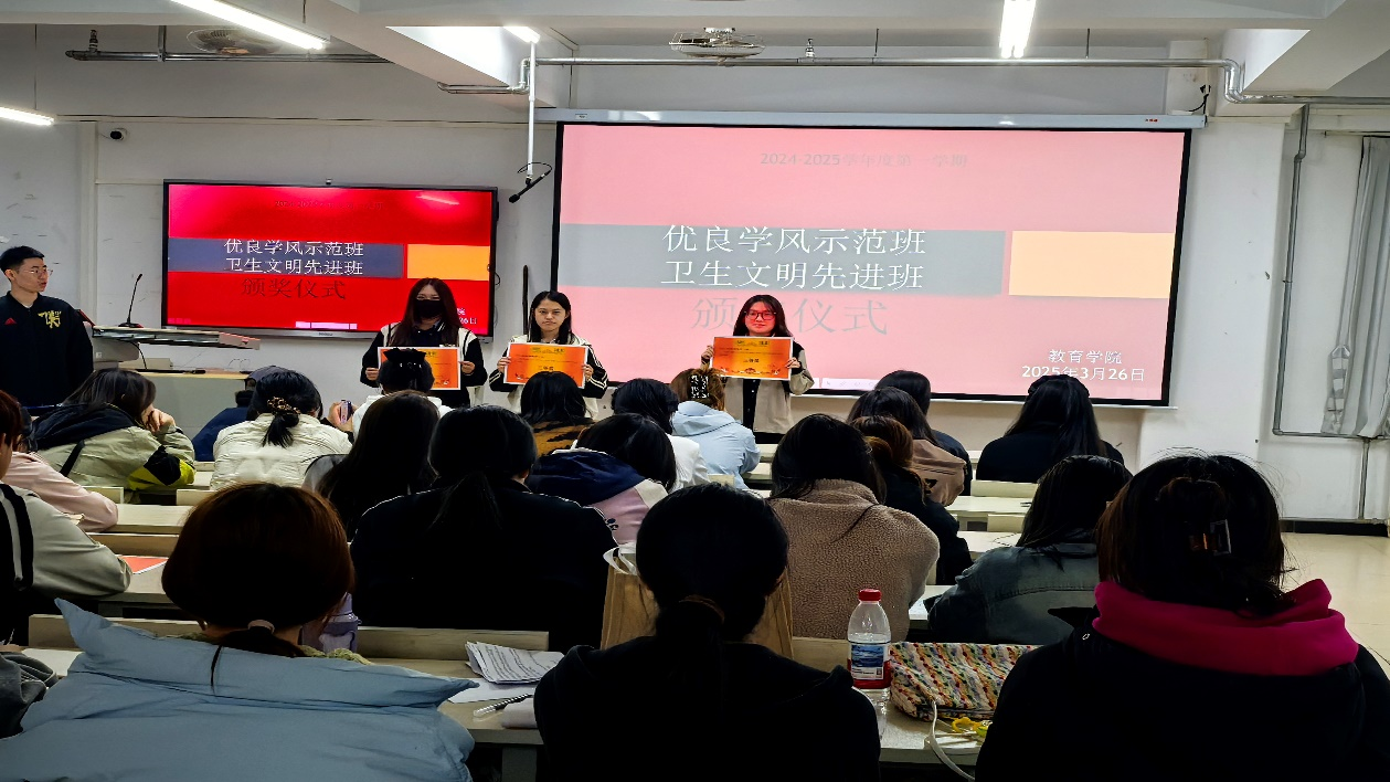 为持续优化优良学风建设,营造文明和谐的育人环境,3月26日晚,bevictor伟德官网在特教楼503教室成功2024-2025学年度第一学期“优良学风示范班”“卫生文明先进班”表彰活动2023级、2024级全体员工干部积极参与本次颁奖活动。