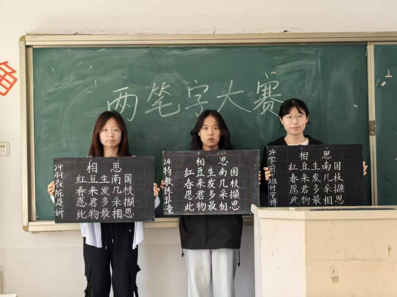 两笔字比赛现场墨香满溢,选手们执笔凝神,挥毫落纸。钢笔字工整隽秀,粉笔字遒劲舒展,一笔一画间彰显师范生"字如其人"的素养追求。