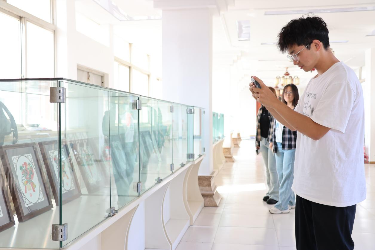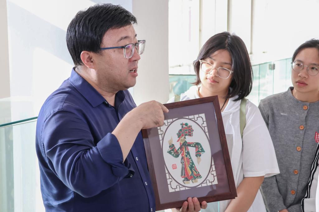 随后,在教育公司党委书记贾长胜与周馆长的带领下,师生们移步连廊,近距离参观了皮影展品。周馆长逐一对展品的题材来源艺术风格及文化寓意进行解读。从经典剧目角色到现代创新设计,每一件皮影作品都成了鲜活的文化教材,让师生在近距离观赏中深化了对非遗艺术的认知。
